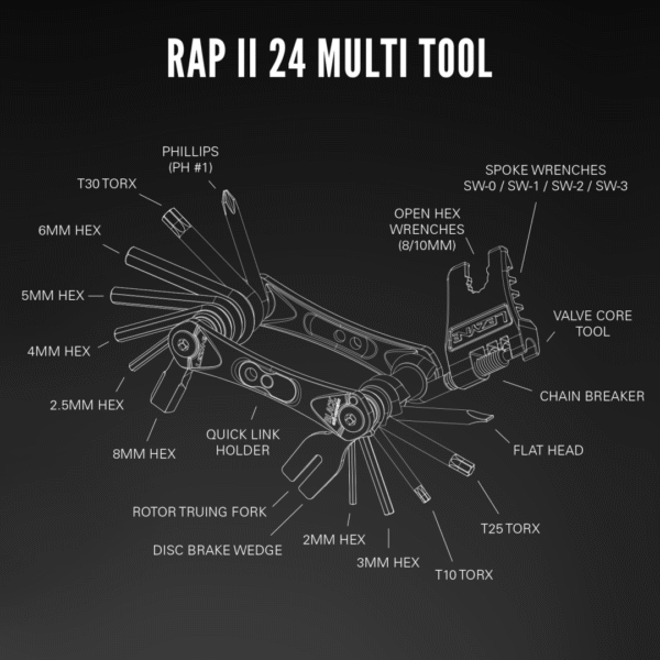 Die Multitools der Rap II-Serie vereinen Stil, Technologie und ultimatives Preis-Leistungs-Verhältnis und bieten unübertroffene Leistung für ihre Preisklasse. Diese im eigenen Haus entwickelten und hergestellten Multi-Tools verfügen über eine Reihe innovativer Eigenschaften. Die ergonomischen Seitenplatten sind aus leichtem Aluminium gefertigt und bieten eine spezielle Magnethalterung für eine schnelle Notverbindung. Die Stahlbits sind jetzt länger und verfügen über unsere schwarze Anti-Korrosions-Technologie, die eine hervorragende Korrosionsbeständigkeit bietet. Sieben Konfigurationen stehen zur Verfügung, mit aktuellen Optionen für alle modernen Fahrräder, einschließlich Gravelbikes, Mountainbikes, E-Bikes und Rennräder. Diese kompakten und vielseitigen Mini-Werkzeuge sind langlebig und so konzipiert, dass sie den Fahrer effizient auf die Straße oder den Trail zurückbringen.
